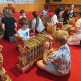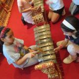Ens van explicar que el Gamelan està compost per gongs de diferents mides, tambors, molts metal·lòfons de làmines, metal·lòfons fets amb gongs i molts instruments més, que cada persona que toca té les seves notes i entre tots creen les músiques i cançons... Per tant, han de tocar tots junts i en equip per poder interpretar les músiques. També vam descobrir que a Bali utilitzen unes notes diferents de les nostres: gong, gung, gang geng i ging, i vam poder comprovar per què es diuen així.