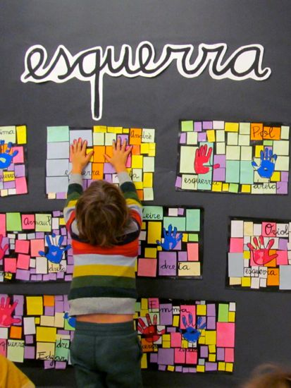 Aprendre i dominar els conceptes esquerra-dreta és molt important per a l’aprenentatge de la lectura i la escriptura. A classe hem elaborat un mural on cada nen ha imprès les seves mans. I, a més a més, entre altres exercicis també fem jocs com podeu veure en les imatges següents.