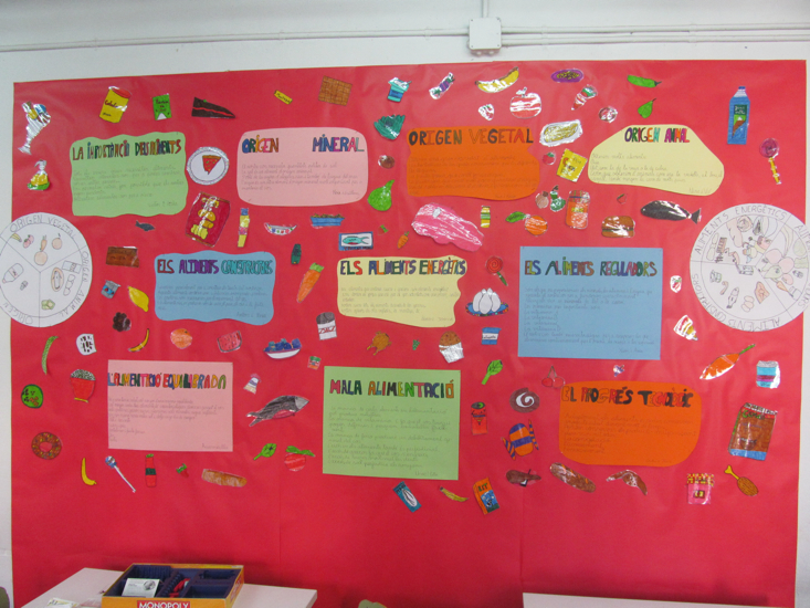 A Coneixement del medi hem estudiat l’alimentació. Ara sabem com podem separar els aliments segons el seu origen o també segons el que ens aporten. Per estudiar millor aquest tema, hem confeccionat un gran mural. Ens hem dividit en parelles i cada una ha fet una part d’aquest mural.